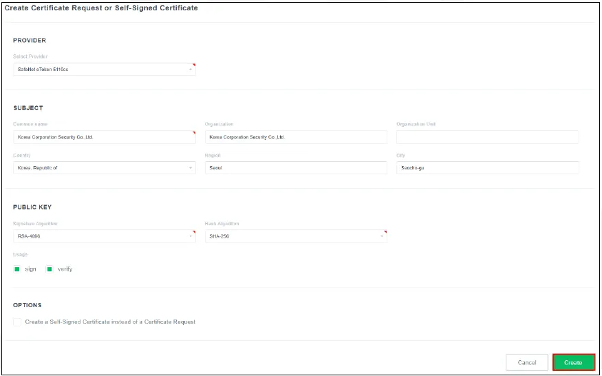 ④ 신청하신 정보로 인증서 세부정보가 나타납니다. 정보 확인 후, Create을 선택하여 진행합니다.