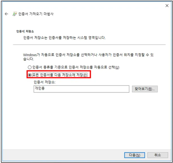 ⑧ ‘인증서 가져오기 마법사’에서 인증서를 선택합니다.