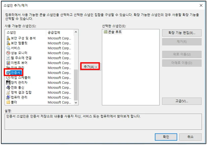 ② 파일 > 스냅인 추가/제거를 선택합니다.