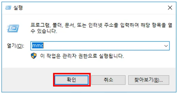 ① ‘실행’ 창에서 MMC를 실행합니다.