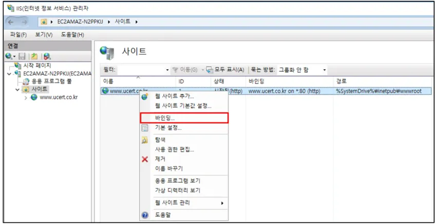 ① SSL 인증서를 설치할 웹사이트 목록의 마우스 오른쪽을 클릭하여 바인딩 편집을 선택합니다. 그 후에 추가 버튼을 선택합니다.