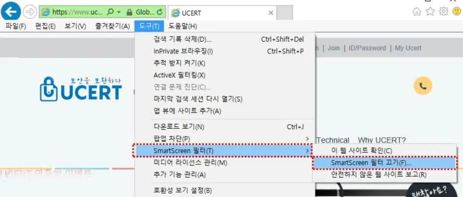 Internet Explorer(인터넷 익스플로러) 메뉴의[도구] → [SmartScreen 필터] → [SmartScreen 필터 끄기] → 'SmartScreen 필터 해제' 클릭