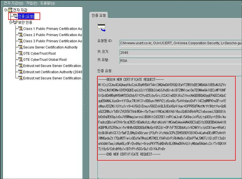 6. ----BEGIN NEW CERTIFICATE REQUEST-----부터-----END NEW CERTIFICATE REQUEST-----까지 복사합니다.