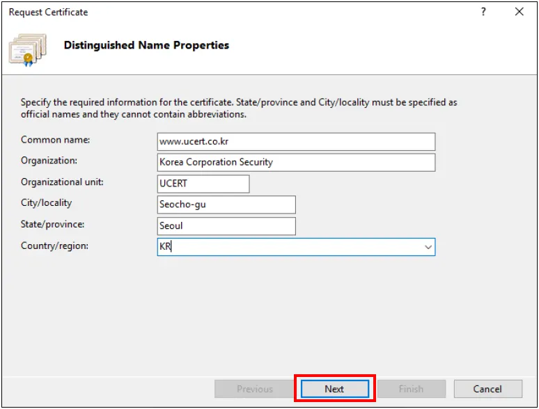 4. 다음과 같이 CSR 생성에 필요한 정보를 입력 후, “Next”를 클릭합니다.