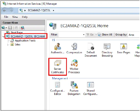 2. 인증서를 설치할 서버 이름을 선택하고, 오른쪽의 “서버 인증서”를 선택합니다.