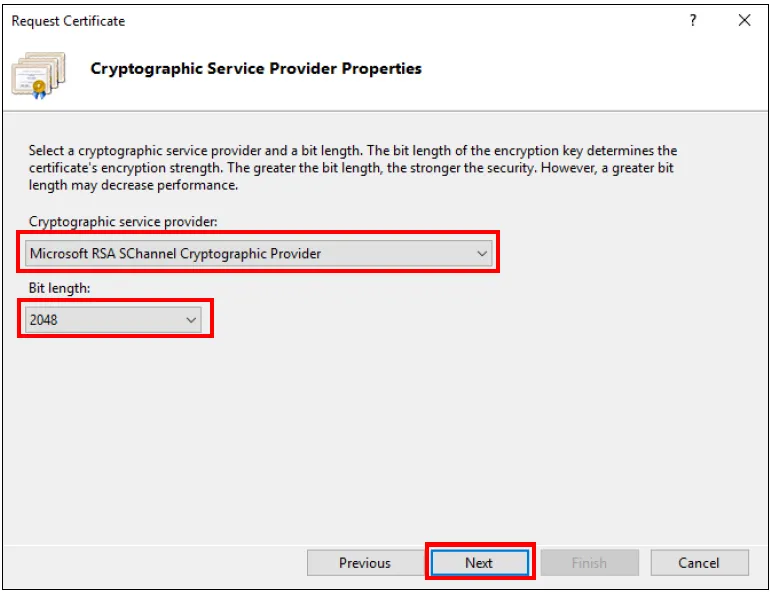 5. “암호화 서비스 공급자 속성” 창에서 “Microsoft RSA SChannel Cryptographic Provider”, “2048 Bit”로 선택 후, “Next”를 클릭합니다.