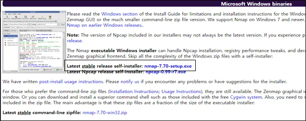 ① https://nmap.org/download.html 에서 프로그램을 다운로드합니다.
