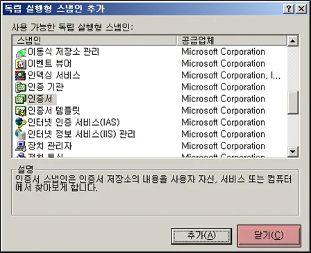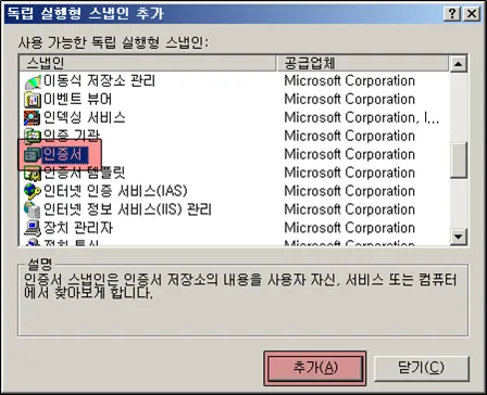 ④ 인증서 선택 후 추가를 클릭 합니다.
