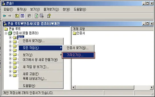 ② 콘솔 루트 → 인증서(로컬 컴퓨터) → 개인 → 오른쪽 마우스 클릭 → 모든 작업(K) → 가져오기(I)를 클릭 합니다.