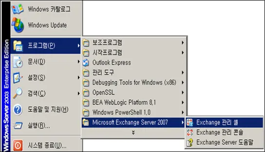 시작 -> 프로그램 -> Microsoft Exchange Server 2007 -> Exchange 관리 셸 실행