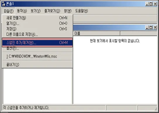 ② 파일 → 스냅인 추가/제거(M) 선택 하거나 단축키 Ctrl+M을 입력 합니다.