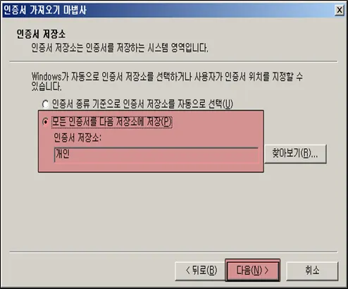 ⑧ 인증 저장소가 개인인지 확인 후 다음을 클릭 합니다.