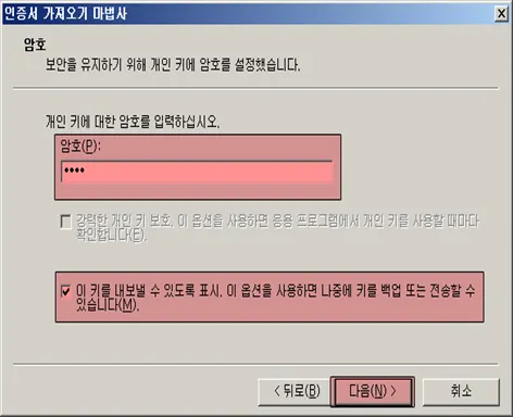 ⑦ 암호를 입력 후 이 키를 내보낼 수 있도록 표시를 체크 후 다음을 클릭 합니다.