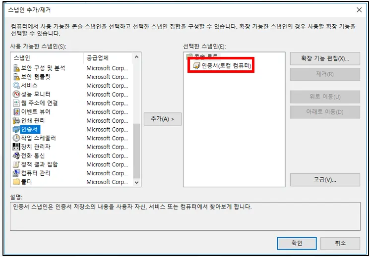 ③ 추가된 인증서를 확인하신 후, 닫기를 클릭합니다.