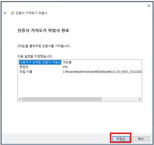 ⑤ 추가된 인증서를 확인하신 후, 닫기를 클릭합니다.