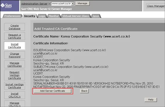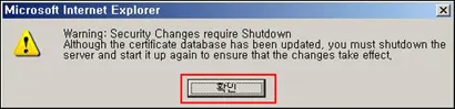 ⑥ Add Server Ceritificate"를 클릭 한 후 뜨는 안내메세지에 확인, 확인을 클릭합니다.