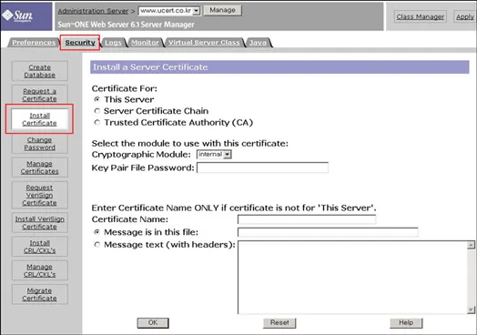 ① Security → Install Certificate 에서"This Server" 를 선택, 패스워드를 입력 후 발급받은 도메인 인증서 코드를 삽입합니다.