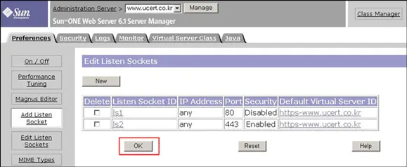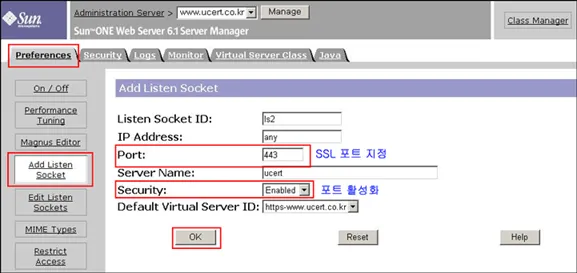 ④ Preferences> Add Listen Socket 으로 이동하여 SSL포트 와 포트 활성화 설정v을 한 후 "OK"를 클릭합니다.