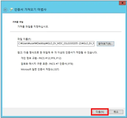 ⑧ ‘인증서 가져오기 마법사’에서 인증서를 선택합니다.