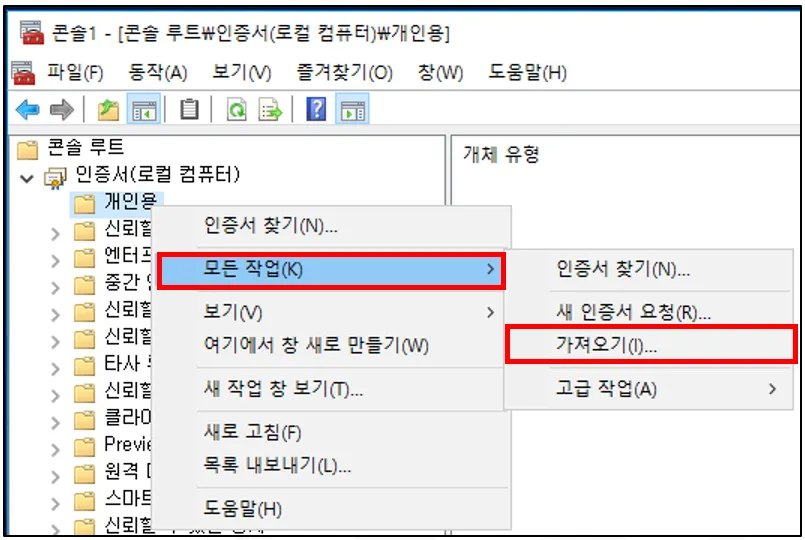 ⑦ 추가된 인증서 스냅인에서 ‘개인용’ 파일 - 마우스 우클릭 → ‘모든 작업’ → ‘가져오기’